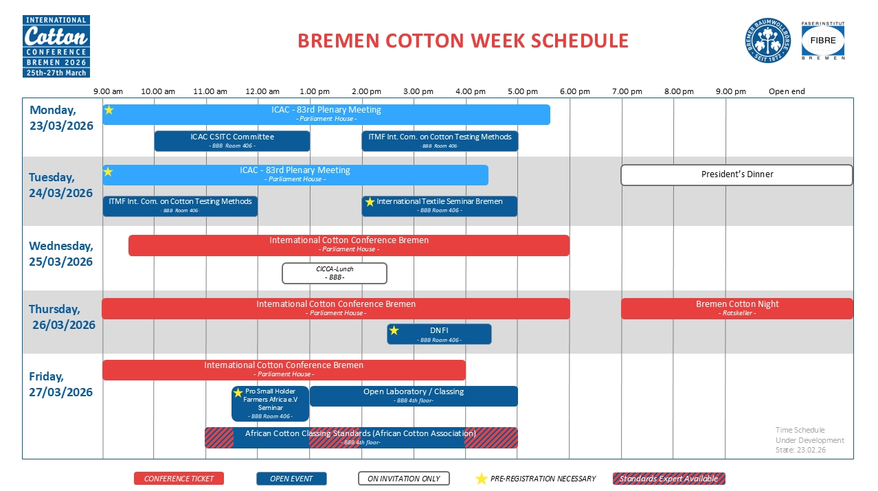 Dear participants of the various meetings at Bremen Cotton Week, The seminar, ‘AI and Digitalisation: Opportunities for the Textile Industry’, offers a platform for gaining practical insights and strategic orientation, as well as discussing current technical developments. The lectures, delivered by nine international experts in textile processes and software, cover topics ranging from product ideas and procurement to quality assurance, with a focus on AI as the new tool of the textile industry. All times are local Central European Time (CET).